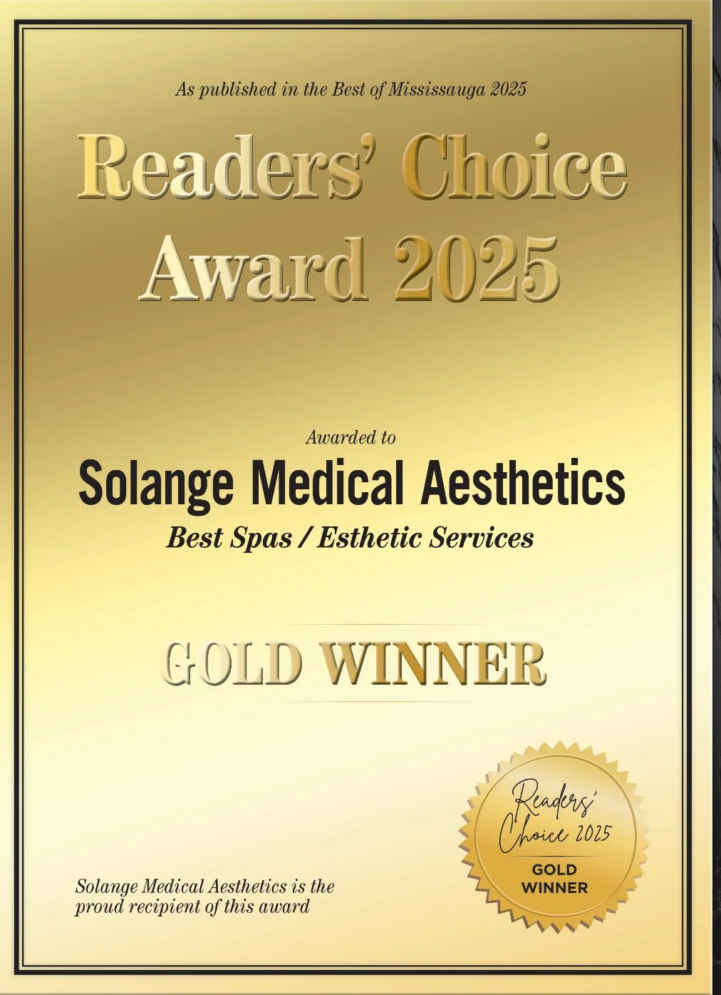Weβre proud to be winners of the Readers Choice Gold and Platinum awards for Excellence in Medical and Health Services, as well as Laser Skin Rejuvenation in Hamilton. As well as the Proud winners of the Readerβs Choice Gold award for Best Spa/ Esthetic Services in Mississauga!